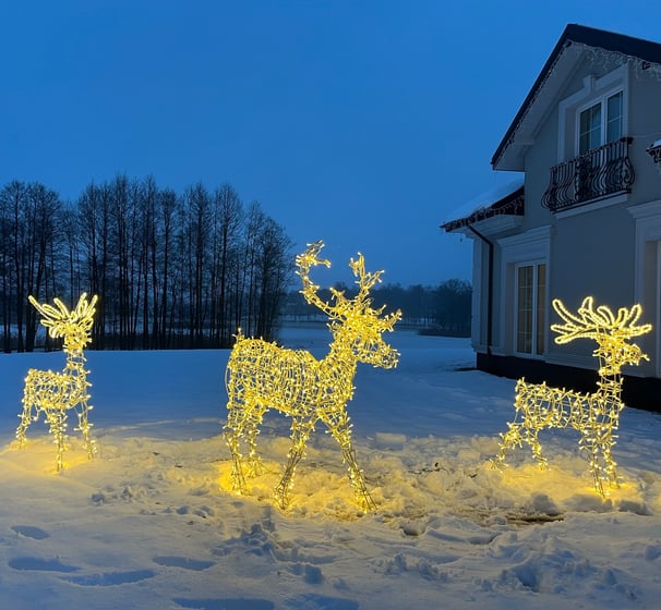 Mūsų profesionalų komanda išklausiusi Jūsų pageidavimus suras patį geriausią sprendimą papuošti Jūsų namus ir aplinką. Atvažiuosime, sumontuosime, o po šventinio laikotarpio demontuosime ir išsivešime. Tai yra unikali ir nauja rinkoje paslauga kuri padės jums išvengti brangių dekoracijų įsigijimo, montavimo ir sandeliavymo rūpesčių. Galime papuošti tiek Jūsų namus tiek teritorija. Sumontuoti karkasines egles, pastatyti kieme šviečiančias elnių ar kitų gyvūnų skulptūras